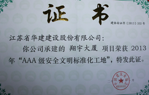 日前,由上海區(qū)域公司蘇北分公司承建的淮安翔宇大廈被中國建筑業(yè)協(xié)會評為2013年全國“AAA級安全文明標(biāo)準(zhǔn)化工地”,這是國內(nèi)安全文明施工最高獎項(xiàng),旨在規(guī)范建筑施工安全生產(chǎn),保障建筑職工安全與健康,提高施工現(xiàn)場安全管理水平。這是上海區(qū)域公司第一次獲此殊榮,也是江蘇華建第8項(xiàng)全國3A級安全文明標(biāo)準(zhǔn)化工地,該工程還被評為2012年度江蘇省建筑施工文明工地、2013年度江蘇省建筑業(yè)新技術(shù)應(yīng)用示范工程。
