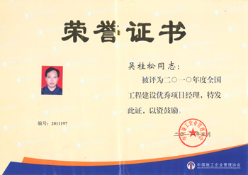 富有成效的工作,一絲不茍的精神,贏得了多方的肯定和褒獎。2010年被評為廣東省優(yōu)秀項目經(jīng)理,2011年被評為全國項目經(jīng)理。